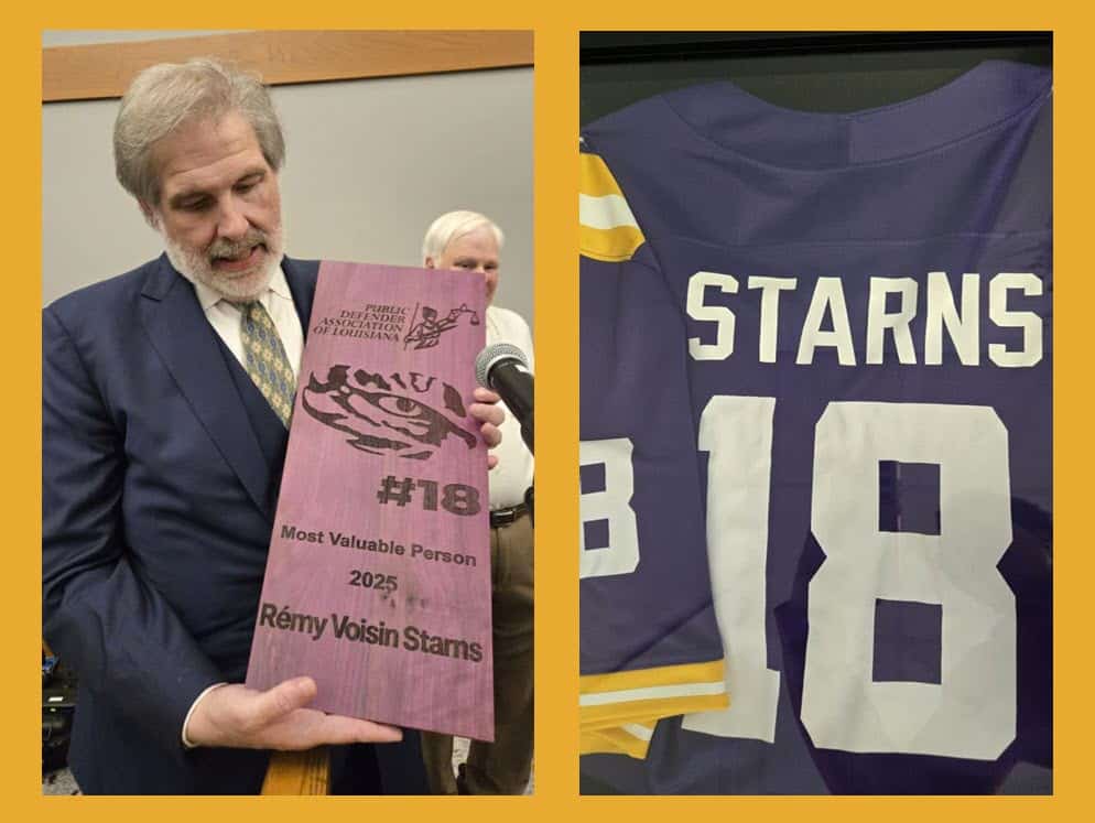 The two-day seminar proved to be an exceptional demonstration of unity between all public defenders and all OSPD staff after years of unnecessary rancor and division. During the Panel Discussion/Town Hall meeting and at the reception that followed, District Public Defenders presented Mr. Starns with a strong letter of support signed by every District Public Defender, a beautiful handmade plaque made by Districts 30/36 District Defender Tony Tillman, and a personalized #18 LSU football jersey. SPD Starns humbly and proudly accepted these “olive branch” honors given “in appreciation” of his efforts to “improve public defender services, increase funding, and pursue access to health insurance coverage” and expressed his heartfelt thanks to all of the PDAL members.