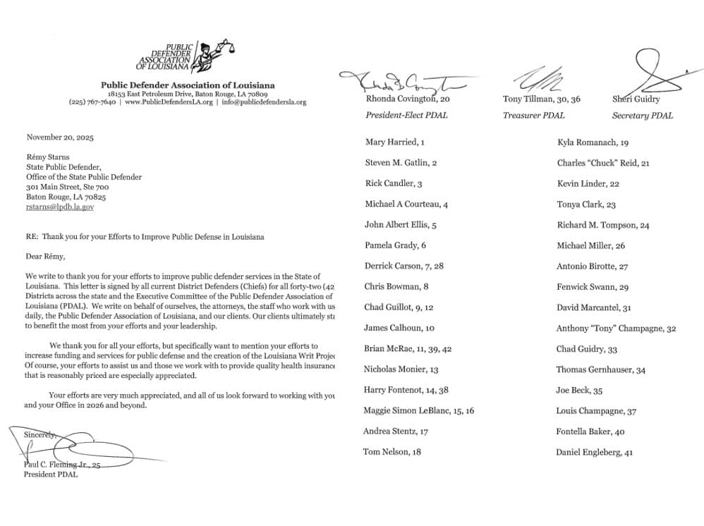 On November 20th and 21st, on invitation of Paul Fleming, President of the Public Defender Association of Louisiana (PDAL), on behalf of the entire organization, State Public Defender Rémy Starns, along with four executive staff members of Office of State Public Defender (OSPD), traveled to Lake Charles and participated in the 2025 PDAL Annual Meeting and CLE Seminar. This year’s meeting drew 150 registered attendees representing district and line Public Defenders from across Louisiana. Mr. Starns expressed his belief that this record crowd gathered in response to the new spirit of optimism and cooperation amongst all in the public defender system.